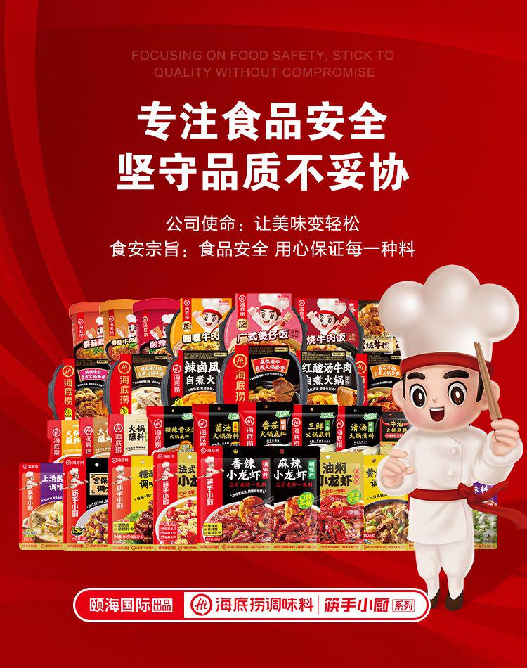我們是海底撈集團(tuán)的核心火鍋底料供應(yīng)商,擁有海底撈品牌調(diào)味料類別的永久授權(quán)。頤海集研發(fā)、生產(chǎn)、銷售一體化經(jīng)營的公司,現(xiàn)有4大業(yè)務(wù)包括火鍋底料,復(fù)合調(diào)味料,火鍋蘸料和方便面速食系列。頤海的使命是讓美味變輕松。